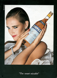 Attractive models are used to promote products. Campari is being presented in this advert with a sexually provocative look. The inferred connection is enhanced by adding the pornographic image to the bottle.