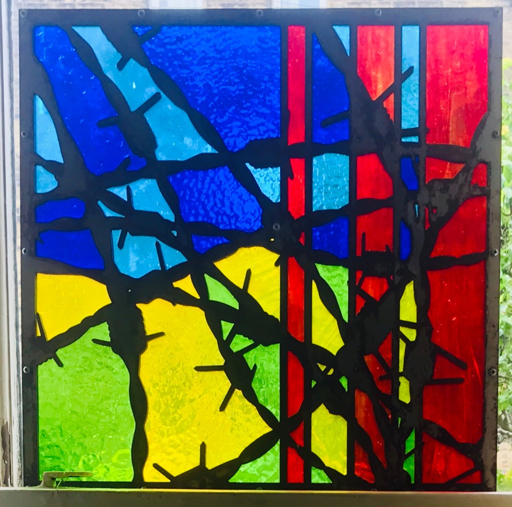 By utilising laser cutting technology I have created a new form of stained glass panel that enables more organic and dynamic windows. This panel is created from 3 layers of laser cut 3mm galvanised sheet steel, sandwiched together.